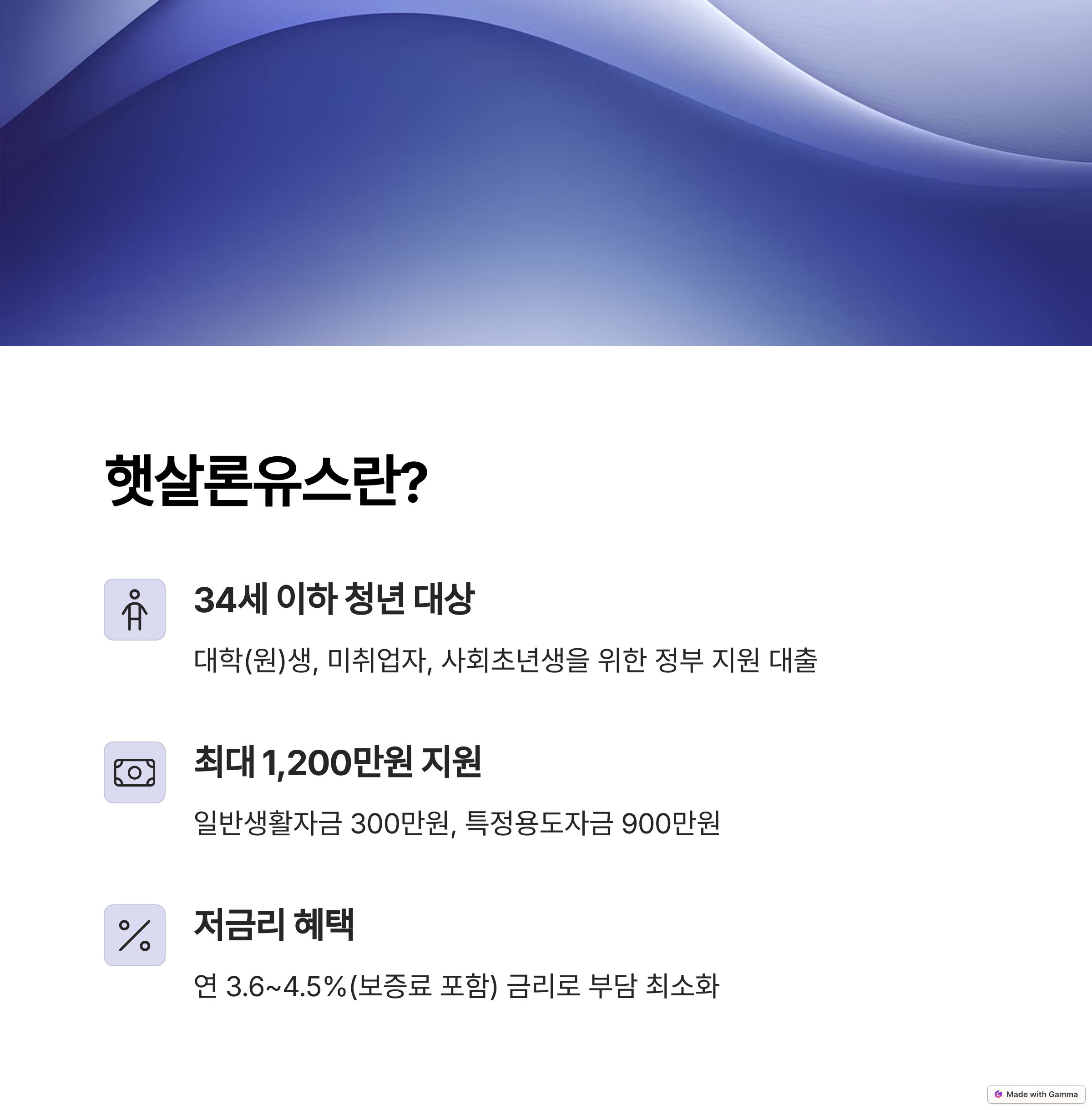 '햇살론유스'는 34세 이하의 대학(원)생, 미취업 청년, 사회초년생(중소기업 재직 1년 이하)을 대상으로 정부가 지원하는 보증부 대출 프로그램입니다.