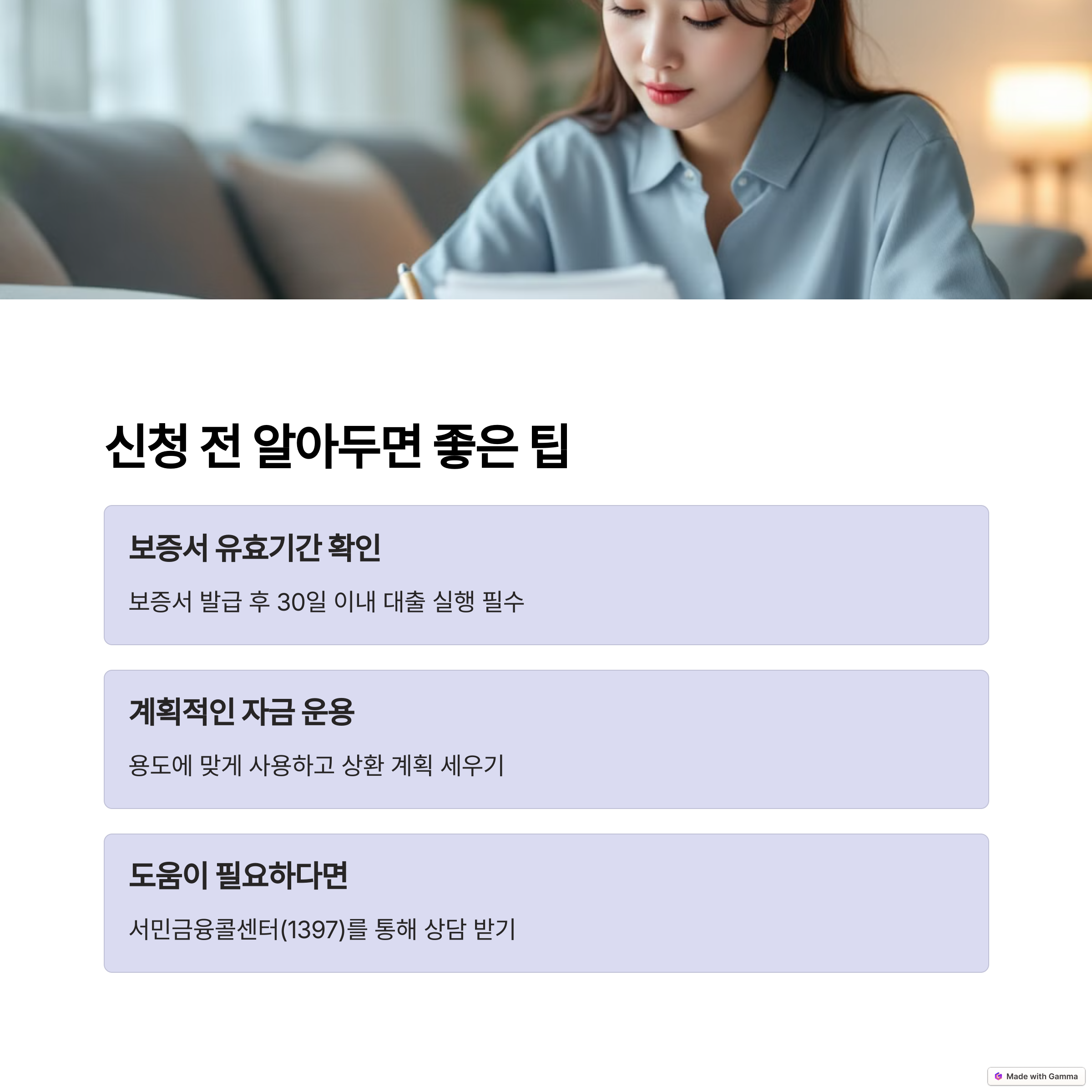 해당 조건을 충족한 경우, 서민금융진흥원의 심사를 거쳐 보증 승인을 받아야 하며, 이후 대출기관의 심사를 통해 최종 확정됩니다.